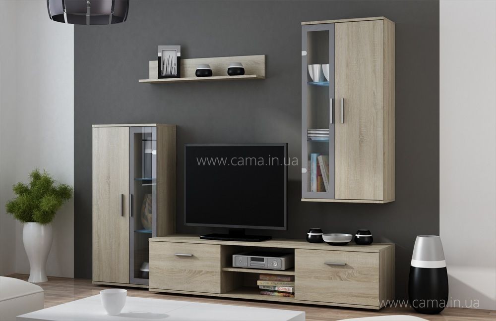 Гостиная Dora - новая модель от дизайнеров мебельной фабрики Cama, которая состоит всего из четырех элементов - двух витрин, полки и комода под ТВ.
