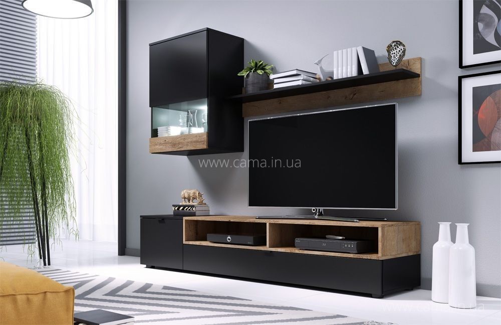 - 1 x тумбы под ТВ (в / ш / г - 34/175/39 см) состоит из одной дверной части, откидной створки и двух углублений для аудио-видео оборудования;