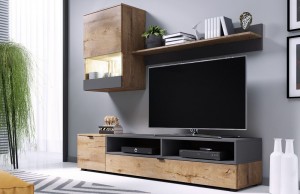 - 1 x тумбы под ТВ (в / ш / г - 34/175/39 см) состоит из одной дверной части, откидной створки и двух углублений для аудио и видео оборудования;