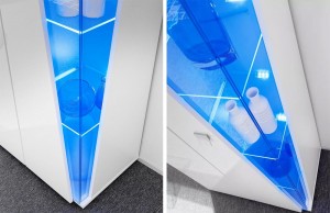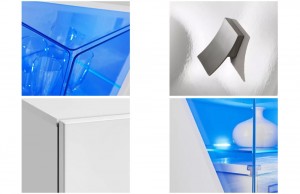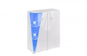 Витрина низкая: одна дверца, боковые и верхняя часть частично застеклены. Одна обычная дверь. За ними 2 стандартные полки и 2 стеклянные полки со светодиодной подсветкой. Металлические ножки.