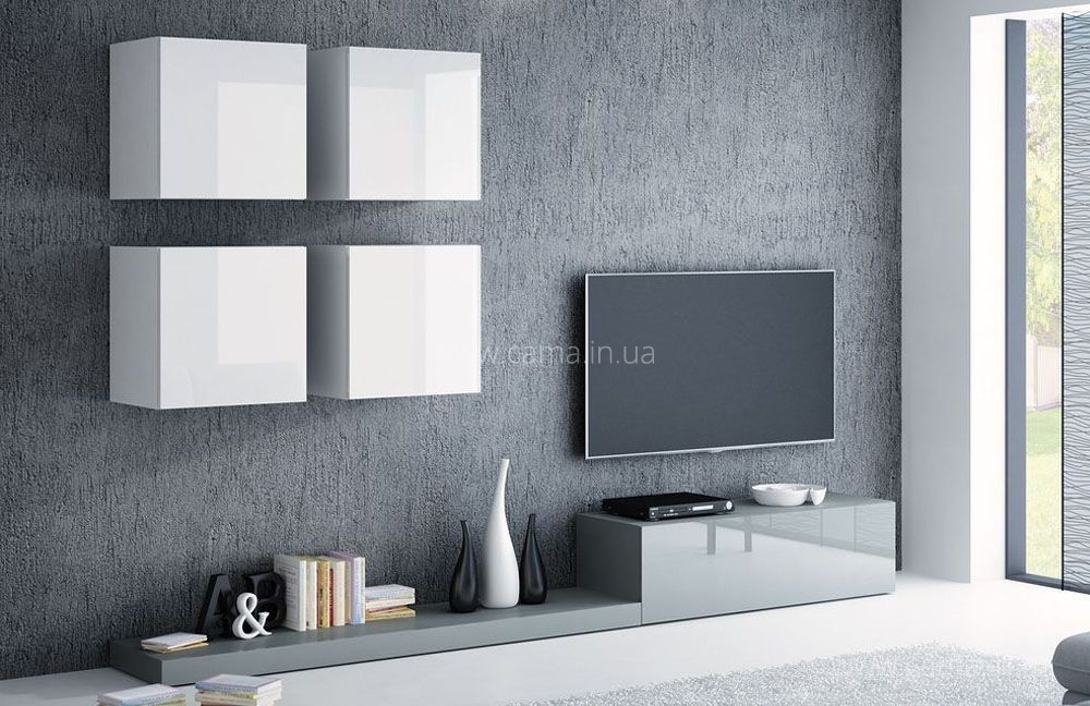 Современная, стильная гостиная Pixel 2 от известной фабрики Cama доступен во многих цветовых вариантах - вы можете свободно выбирать цвет как телевизионных тумб, так и навесных витрин.