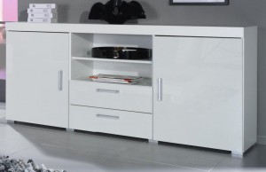 Широкий и функциональный комод из набора мебели Самба фабрики КамаКомод: 80/164/45 - с левой и правой стороны двери глянцевые, внутри одна полка обычная, посередине два выдвижных ящика, фасад глянцевый, две отдела под технику.