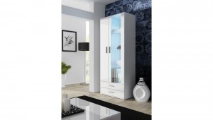 Один фасад глянцевый со стеклом, внутри три стеклянные полки с возможностью установки 3 Led подсветки, второй фасад глухой,глянцевой,внутри три полки обычные, внизу два выдвижных ящика, фасады в глянцевые, установка дверей универсальная ( право/лево).Подсветка не входит в комплект поставки.