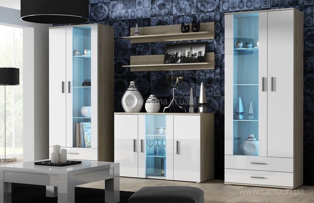 Фасад: МДФ ламинированный глянцевый, закаленное стеклоГостиная Soho 10 это пример компоновки элементов модульной системы Сохо, при заказе вы можете либо купить готовый набор, либо создать свой набор из различных элементов представленых в каталоге на нашем сайте